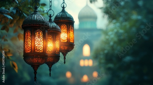 Green theme Ramadan background with lanterns on edges and corners, blurred mosque behind. ideal for cultural or religious themes, travel destinations, or Ramadan related designs.