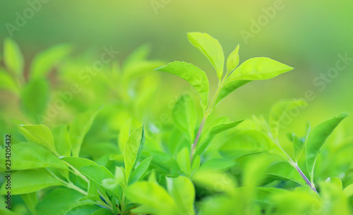 Green tree leaf on blurred background in the park with copy space and clean pattern. Close-up nature leaves in field for use in web design or wallpaper.