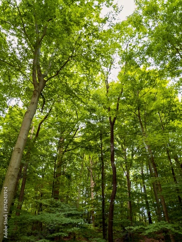 Green tree woodland at Pymatuning State Park in Pennsylvania. Trees with green leaves.