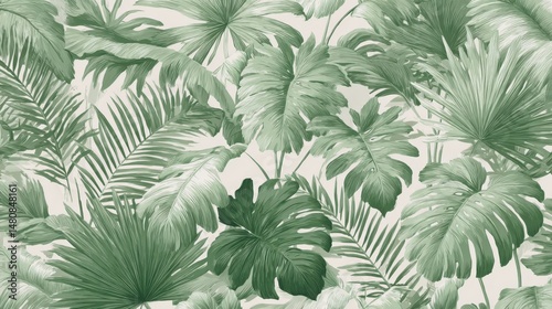 Green tropical leaves overlapping in seamless, dense arrangement, forming lush jungle like pattern suitable for botanical backgrounds, fabric prints, wallpaper design