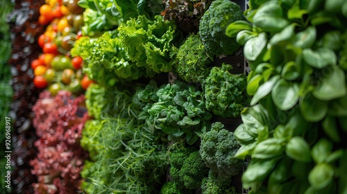 Green Vertical Hydroponic Garden with Herbs and Vegetables for Urban Farming Concept, Copy Space on Right Side