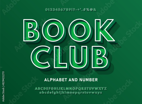 Green volumetric 3d alphabet with a thin outline. Chic urban 3D font with signs, symbols and numbers. Book club