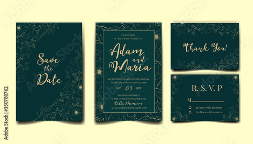 Green Wedding invitation card template set with hand drawn outline floral frame and border. Flowers decoration for save the date, greeting, rsvp, poster, cover, Botanic illustration premium vector