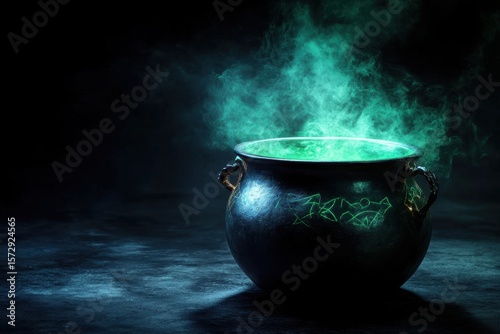 Green witches cauldron with glowing potion and mystical smoke against a dark background, Green Witches Cauldron Isolated On Black