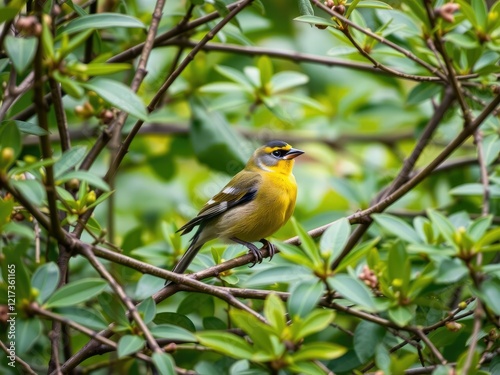 Greenfinch bird sitting in dense foliage branches, greenfinch, birdsong