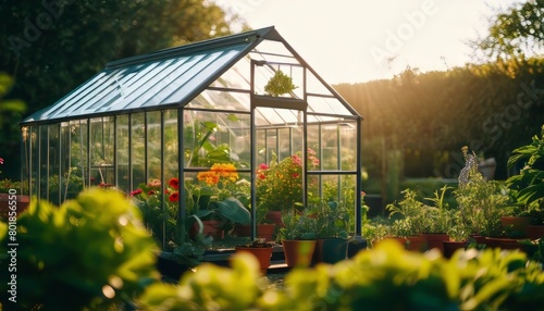 Greenhouse in the garden. Glass small compact greenhouse for growing flowers, vegetables, seedlings