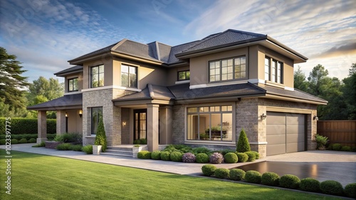 Grey beige large nice house exterior with summer landscape Luxury house exterior with brick and siding trim Medium Shot