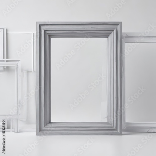 Grey geometric frames highlight photos on clean white background, sleek, album layout