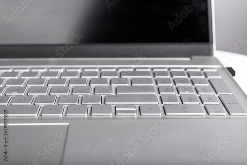 Grey laptop with keyboard and touchscreen closeup. Electronic device for work, education, relax. High quality photo