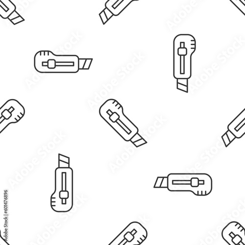 Grey line Stationery knife icon isolated seamless pattern on white background. Office paper cutter. Vector