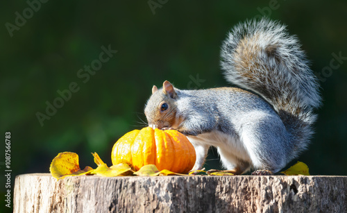 Grey squirrel investigating pumkin on a tree stump in autumn