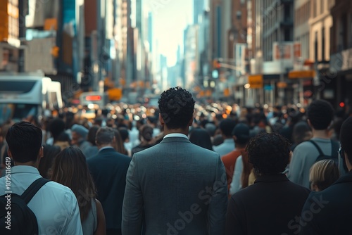 Grey Suit, City Crowd Anonymous Back View, Blurred Background