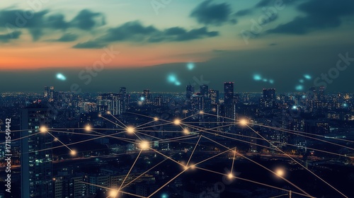 grid. Abstract city skyline with glowing connection lines, set against a gradient-lit atmospheric backdrop. real-estate listings.