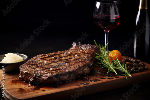 Grilled beef steak with herbs on a plate with a glass of wine, dark background