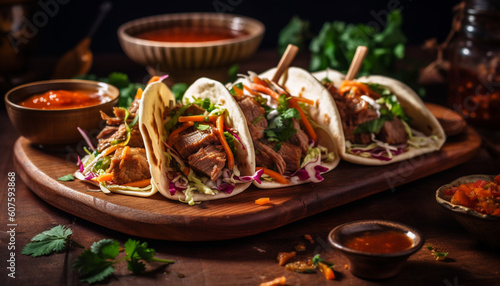 Grilled beef taco with fresh guacamole and cilantro generated by AI
