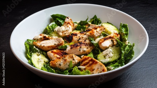 Grilled chicken and romaine lettuce Caesar salad with creamy dressing, cooked and ready to serve.