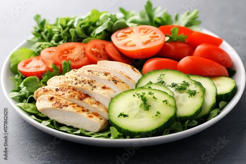 Grilled chicken breast, fillet, and a fresh vegetable salad with lettuce, arugula, spinach, cucumber, and tomato. Healthy lunch option