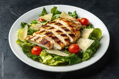 Grilled chicken Caesar salad with parmesan cherry tomatoes and dressing displayed on a white plate against a black concrete backdrop Top down perspective