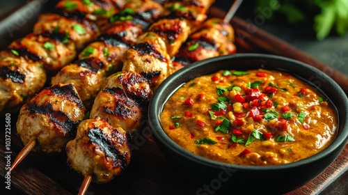 Grilled chicken skewers with satay sauce.