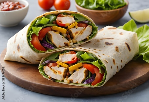 Grilled Chicken Wrap, Healthy Lunch Idea. Fresh Vegetables And Tasty Chicken In Soft Flatbread. Delicious Meal, Perfect For A Quick And Nutritious Bite. Food Photography.