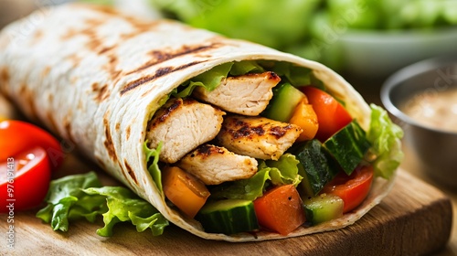 Grilled chicken wrap with fresh lettuce, tomato, cucumber, and bell pepper.