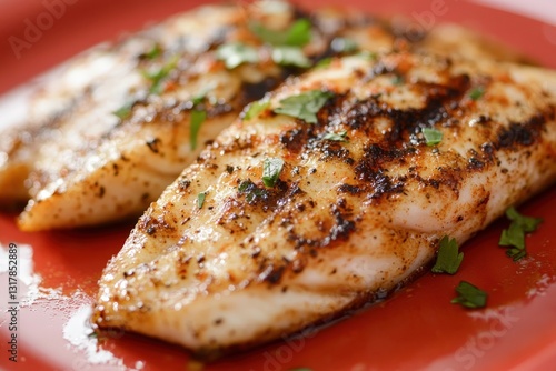 Grilled fish fillets seasoned and garnished sit on a red plate