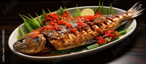 Grilled fish garnished with red chili sauce and fresh herbs on a white platter decorated with lime and chili slices