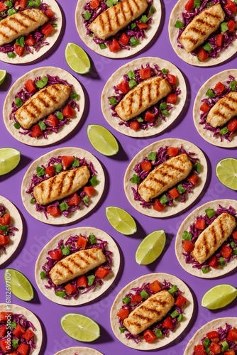 Grilled fish tacos with red cabbage, tomatoes, and cilantro on tortillas, styled in a colorful pattern with lime wedges on a vibrant purple background.