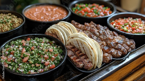 Grilled meat, salads, and flatbreads buffet