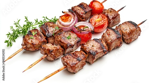 Grilled meat skewers, roasted shish kebab with onion and tomatoes, isolated on white background
