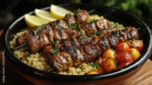 Grilled meat skewers served on a bed of couscous with fresh vegetables and lemon slices
