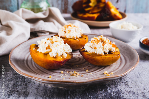 Grilled peach halves with ricotta and nuts on a plate on the table