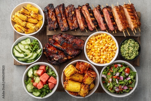 Grilled ribs and corn with salads on wooden board for dinner party, catering, menu, and food blog