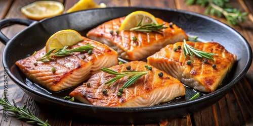 Grilled Salmon Fillets with Lemon and Rosemary in a Cast Iron Skillet, salmon, rosemary, lemon