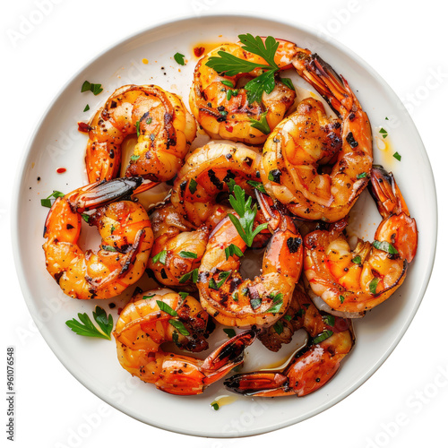 grilled shrimp in a plate top view isolated on transparent white background, clipping path