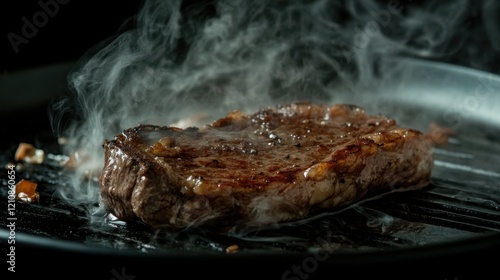 Grilled steak on a hot plate with steam and garnish, emphasizing sizzling freshness.