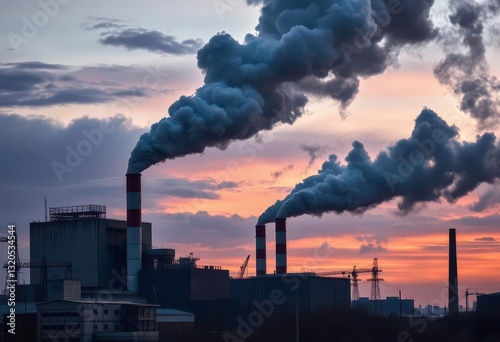 Grimy factory belching black smoke into a polluted sky, contamination, unhealthy