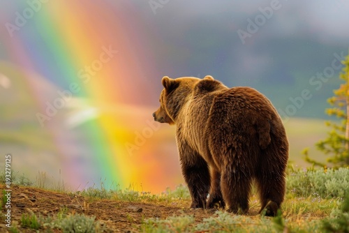 Grizzly bear (Ursus arctos) standing, looking at rainbow, rear view