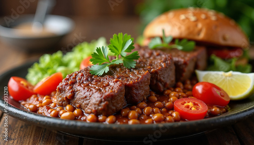 Ground lamb lula kebab served with lentils and fresh vegetables