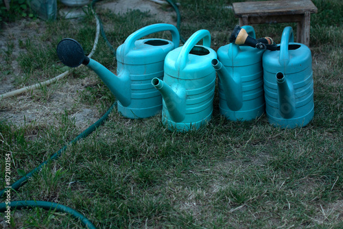 Group of a watering cans near the greenhouse