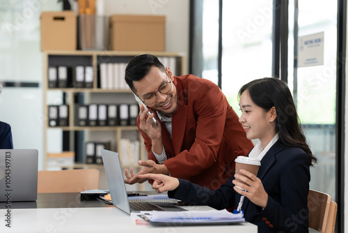 Group of Asian business people brainstorming together using computer technology in modern office working together in office discussing corporate creative project idea.