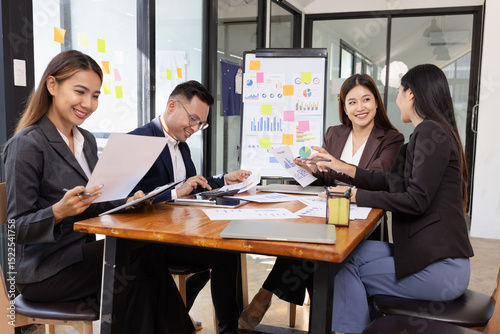 Group of Asian business working plan analysis project brainstorm in modern office, Asian businesspeople team working together, Business startup and company strategy planning concept.