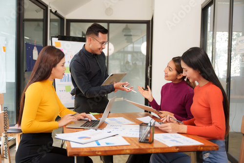 Group of Asian businessmen are sitting in a meeting, talking, exchanging knowledge. Presentation about office work