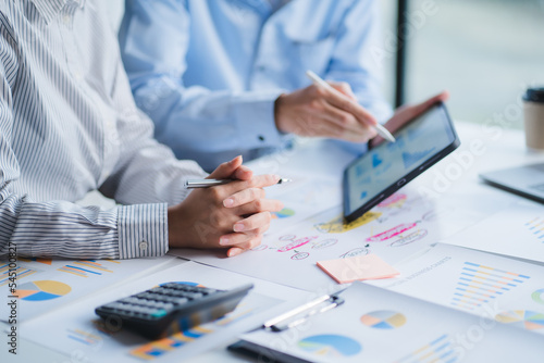 Group of business people meeting together Pointing to the graph assess business profits.