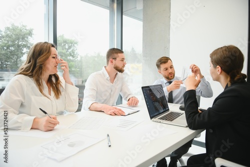 Group of businessmen and businesswomen stock brokers working at office.