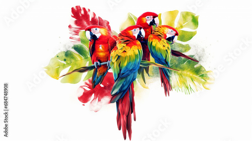 Group of charming colorful parrots perching playfully on a branch, creating a lively and colorful spectacle. A pure white background highlights the beauty of their vibrant plumages.