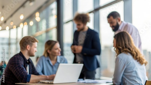 Group of colleagues with laptop open — developing business growth plan in training session