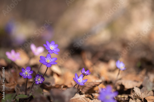 Group of colorful liverworth flowers, hepatica nobilis. Focus on the flower in the middle right.