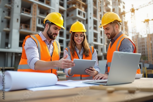 Group of construction professionals in safety gear collaborating on a project at a construction site background.