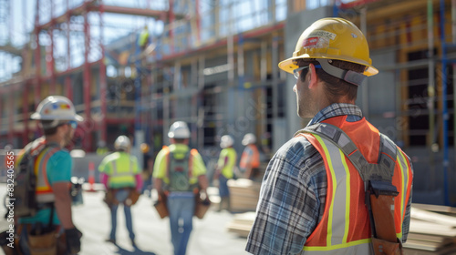 Group of construction workers in safety gear at an active job site, focusing on building structures.